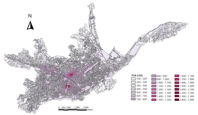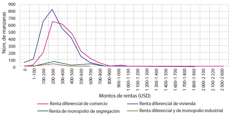 Por su parte, la renta de monopolio de segregación (RMS) se encuentra en un menor porcentaje de manzanas y varía entre 60 y 1 300 USD. Los montos bajos observados en algunas de ellas evidencian que, aun siendo zonas en las que residen familias de altos ingresos, no han logrado consolidarse como asentamientos que impacten en el incremento de los precios del suelo. Los valores altos se presentan a medida que aumenta la cercanía a las centralidades de comercio y servicios.