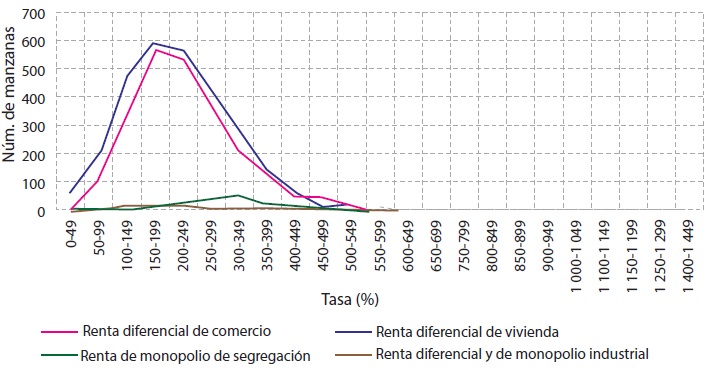 Con los montes máximos de la RSC se calcula la tasa de rentas secundarias capitalizadas que evidencia la rentabilidad máxima obtenida en las manzanas. Tal como se indica en la Figura 12, las manzanas que soportan RDC y RDV presentan conductas similares en cuanto a su número en los rangos de tasas iguales o menores a 450%. Por su parte, las manzanas que soportan RMS se ubican dominantemente en los rangos entre 50 y 450%, en tanto que las tasas más altas son prácticamente exclusivas de las RDC.