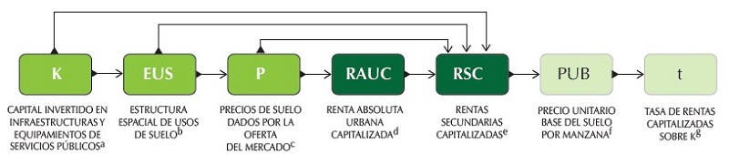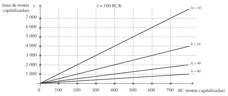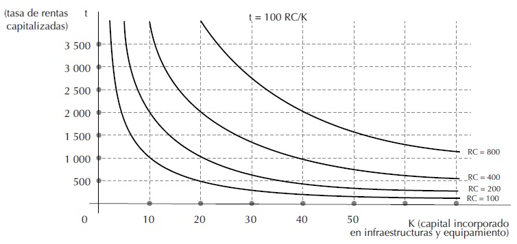 Al relacionar el monto global de las rentas capitalizadas (RC) con el capital incorporado en forma de infraestructuras y equipamientos de servicios públicos (K), es posible obtener la tasa de rentas capitalizadas (t) con la expresión [8] del Cuadro 1.