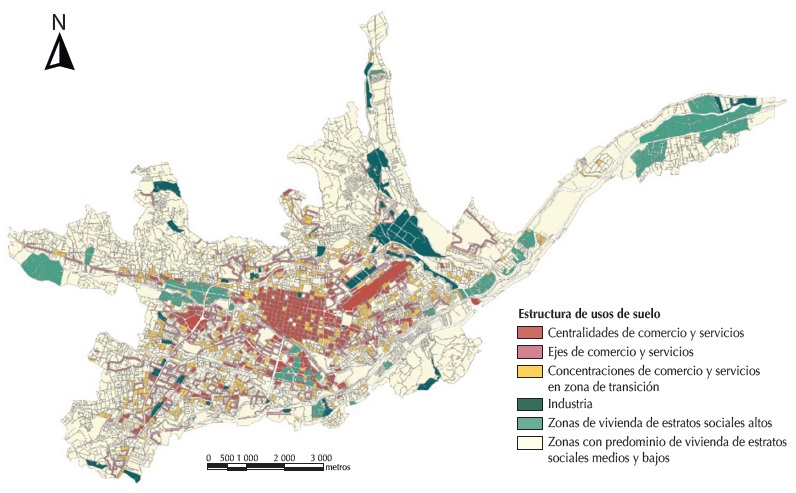Hay un orden ciertamente sustancial atrás del cual, a nivel sensorial, puede figurarse una distribución al azar de los usos de suelo y de la población que éstos conllevan. La estructura espacial de los usos de suelo evidencia la localización de las actividades socioeconómicas en la ciudad, la cual es el resultado de la síntesis no lineal de múltiples variables que entran en juego en las decisiones de los agentes. De esta manera, expresa el acumulado de muchas decisiones y acciones realizadas por la población y sus organizaciones, que giran en torno a la combinación más favorable de dos variables: localización y cantidad de espacio.
