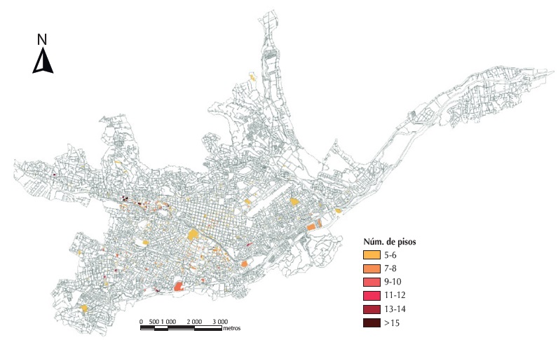 Una de las expresiones espaciales de los usos de suelo cuando éstos alcanzan densidades que demandan mayor espacio construido es la edificación en altura. En Cuenca su presencia se produce en los últimos veinte años de forma predominantemente dispersa -con muy pocas tendencias a la concentración-, sobre todo próximas o como parte de las centralidades de comercio y servicios y en las zonas de vivienda de estratos sociales altos, exceptuándose el Centro Histórico por restricciones normativas (Figura 7).