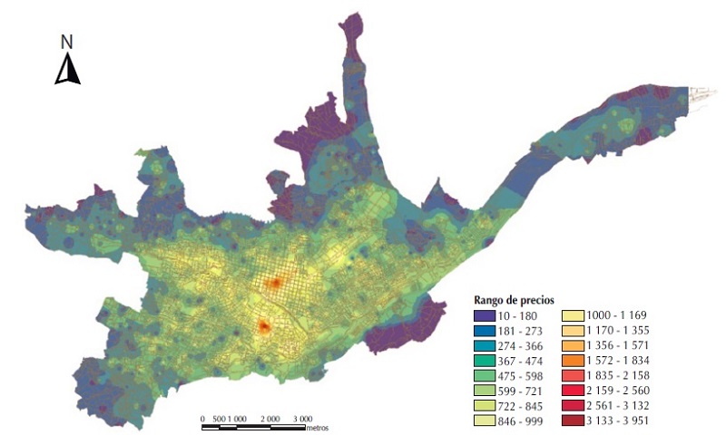 Se levantaron 1 516 datos del área urbana y 127 del suelo rural próximo al límite urbano que cumplen dos condiciones: son de la misma naturaleza, es decir, son valores de mercado, no de cambio; y su localización geográfica está directamente relacionada con la estructura espacial de los usos de suelo. Esto obliga a superar la visión de una muestra estratificada, recurriendo a toda la oferta disponible en el mercado, identificada tanto por recorridos de campo, como la información al respecto publicada en redes sociales, páginas electrónicas de inmobiliarias y prensa escrita. Una vez georreferenciados, se aplica a los propietarios u ofertantes una entrevista estructurada para obtener información necesaria para el cálculo del precio de suelo por metro cuadrado, diferenciando registros de predios sin edificación, con edificación o propiedad horizontal, con el objetivo de excluir, de ser el caso, el valor de la construcción, cuyo cálculo se realiza considerando sus características particulares para posteriormente ejecutar el método residual a partir del año del inmueble y la tasa de depreciación anual.