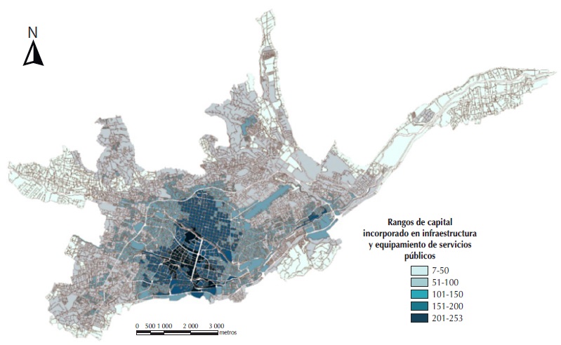 El capital incorporado al suelo en infraestructuras y equipamientos forma parte del precio del suelo e incide en la conformación de la estructura espacial de usos de suelo, pues constituye el soporte material de las actividades socioeconómicas de la ciudad, adquiriendo incluso especificidades en función de éstas.