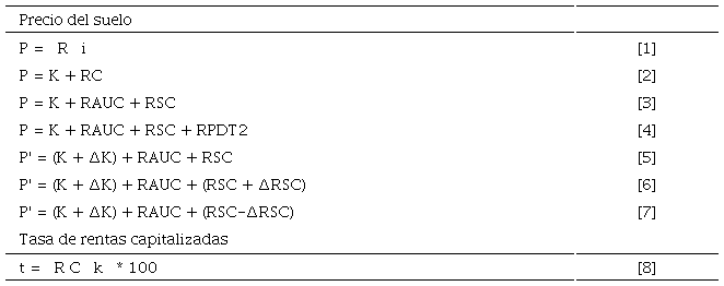 Para el discernimiento de tal correlación se parte de la expresión matemática básica por la cual la magnitud de las rentas del suelo (R) determina el precio (P), pues éste es el resultado de su capitalización a base de una tasa de interés (i) que depende de la tasa media de mercado. Por tanto, P asume la expresión [1] del Cuadro 1 que muestra en forma simplificada la correlación renta y precio del suelo; sin embargo, por la complejidad que entraña la cuantificación de las distintas rentas, se debe considerar que el precio del suelo expresa y adiciona sus respectivas capitalizaciones, las cuales, por la información disponible, corresponden a la oferta del mercado. Por tanto, haciendo R/i = RC = monto global de rentas capitalizadas y considerando el capital fijo incorporado en infraestructuras y equipamientos de servicios públicos (K), se tiene para el cálculo del precio del suelo la expresión [2].