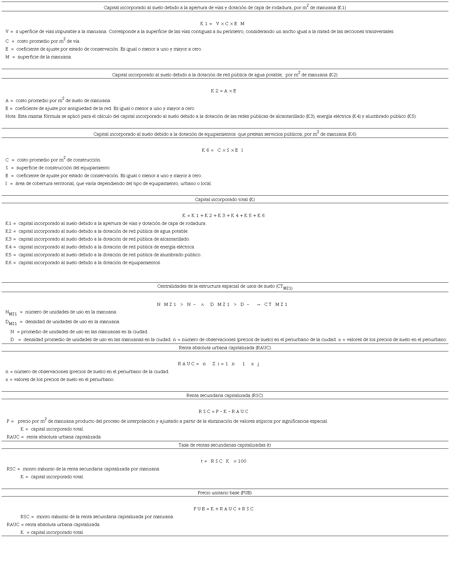 Los modelos propuestos para el cálculo del precio del suelo por manzana y la tasa de renta tienen el carácter de estáticos, y en esta medida son útiles para la valuación colectiva del suelo urbano con fines de la administración municipal, pues su aplicación se produce en un momento o coyuntura de las tres expresiones de la ciudad consideradas para el efecto. La operativización de este método de valuación del suelo se explicita en la Figura 5, en tanto que el detalle de los procedimientos para los respectivos cálculos se describe en el Cuadro 2.