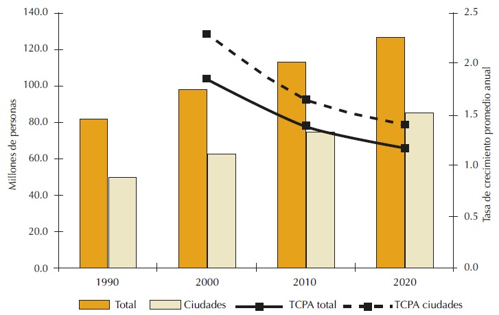 La información y el marco geoestadístico de los censos de población y vivienda ofrecen elementos para establecer que la dinámica demográfica en México entre 1990 y 2020 se caracterizó por la disminución del ritmo de crecimiento y por su tendencia a concentrar cada vez mayor proporción de la población en ciudades y zonas metropolitanas. La población total aumentó de 81.2 a 126 millones de personas, marcando un incremento absoluto de 44.8 millones de personas y TCPA de 1.5%, siendo de 1.9% entre 1990 y 2000, y de 1.2% para el decenio 2010-2020. Por su parte, la población en las 100 principales ciudades, según delimitación fija, creció de 49.9 a 84.9 millones, es decir 35 millones de personas adicionales y TCPA de 1.8%.