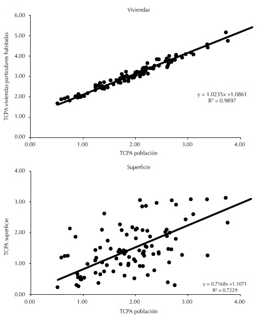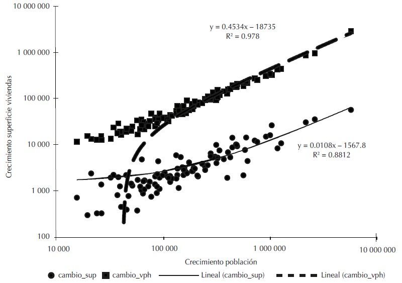 El ritmo de crecimiento de las viviendas se explica en gran medida por la dinámica poblacional. La función de regresión lineal de ajuste estima que la tasa de crecimiento de las viviendas fue de 1%, independientemente de la dinámica demográfica y como resultado de los ajustes en los hogares, además de crecer a una tasa de crecimiento similar a la de la población. En otras palabras, si alguna ciudad habría tenido crecimiento poblacional cero, las viviendas habrían crecido a una tasa promedio anual del 1%. Por su parte, la función de ajuste para la superficie muestra que el dinamismo de la superficie urbana independiente del cambio demográfico fue de 0.10% promedio anual, en tanto que, al aumentar en un punto porcentual la tasa de crecimiento poblacional, la tasa de crecimiento del suelo utilizado para el desarrollo urbano avanzó a razón de 0.72 puntos porcentuales.