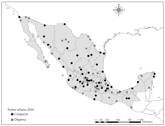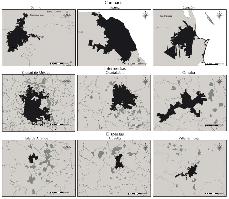 Las principales ciudades del país exhibían diferenciales en su forma urbana y en el patrón de cambio durante el periodo de estudio. En Acuña, Cancún, Ciudad Guzmán, Ciudad Juárez, Nuevo Laredo, Parral y Saltillo, al menos el 95% de su población estaba concentrada; mientras que en Cuautla, Jojutla, La Piedad, Puerto Vallarta, Salina Cruz, Santiago Tianguistenco, Tula de Allende y Villahermosa, menos de la mitad de su población residía en la aglomeración urbana principal. En el Mapa 1 se muestran ejemplos de ciudades compactas, intermedias y dispersas. Las primeras son aquellas en donde 85% o más de su población total se concentraba en la aglomeración principal; la forma urbana intermedia corresponde a ciudades y zonas metropolitanas en donde la aglomeración principal concentraba entre 70 y 84% de la población total, mientras que en las dispersas menos de 70% de la población total residía en la aglomeración principal.