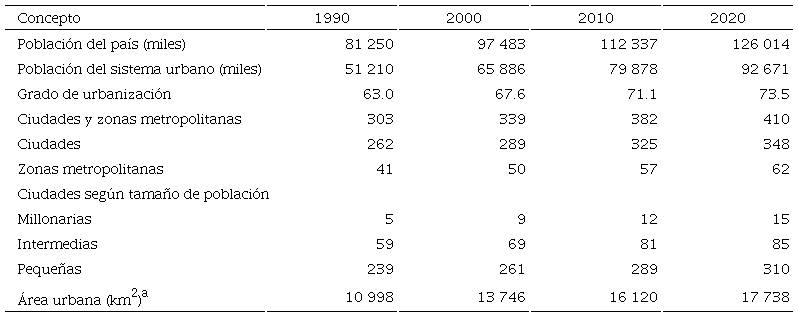 En 1990 el grado de urbanización fue de 63%, mientras que en 2020 se ubicó en 73.5%. La mayor concentración de la población en ciudades se explica principalmente por los flujos de migración interna con origen en comunidades rurales y destino en ciudades. Otro elemento que lo explica, aunque en menor medida, es el aumento en el número de ciudades. Por su parte, el área urbana sumó 10 998 kilómetros cuadrados en 1990, lo que da una densidad promedio de 47 habitantes por hectárea (hab./ha), indicador que aumentó a 52 hab./ha en 2020.3