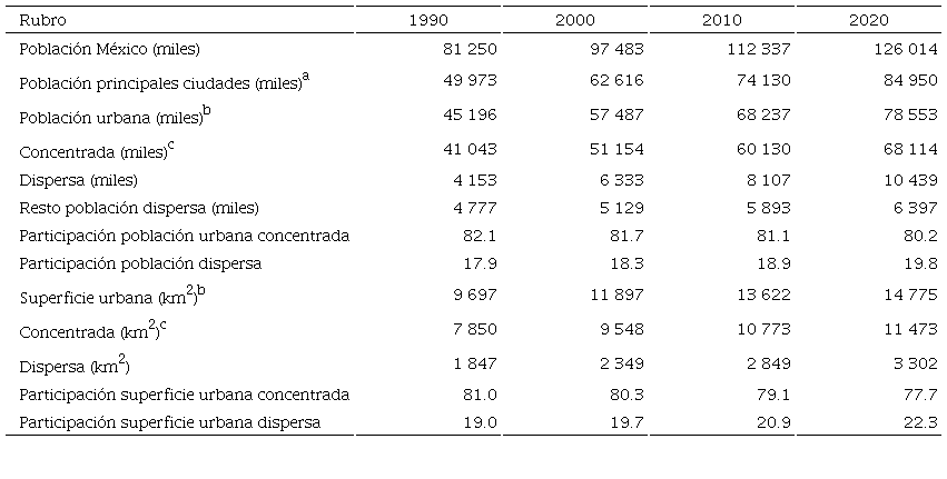 Por su parte, el área urbana de las principales aglomeraciones, es decir, de la población concentrada, sumó 7 850 km2 en 1990 y 11 473 km2 en 2020, lo que implicó un aumento absoluto por 3 623 km2 y relativo de 46%. La superficie de las áreas urbanas dispersas creció de 1 847 a 3 302 km2, una expansión de 1 455 km2 y crecimiento relativo de 79%. Por cada 100 ha de aumento en la urbanización concentrada, hubo 40 ha que se incorporaron a la urbanización dispersa. Como resultado del mayor crecimiento relativo de la población urbana con respecto al área urbana, la densidad de población aumentó de 47 hab./ha en 1990 a 53 hab./ha en 2020. Asimismo, la densidad de población en las áreas concentradas fue significativamente mayor con respecto a la de las áreas dispersas, siendo que en las primeras el indicador subió de 52 a 59 hab./ha entre 1990 y 2020, mientras que en las segundas el incremento fue de 23 a 32 hab./ha. En el marco de la urbanización dispersa, hubo un incremento generalizado de la densidad de población.