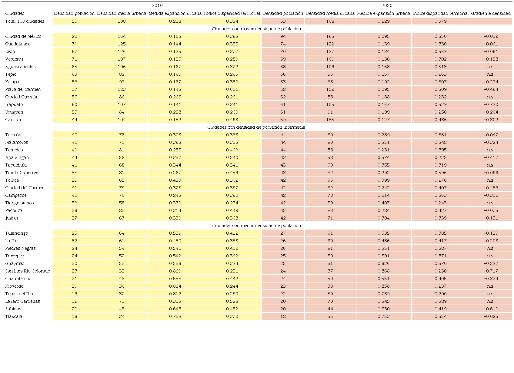 La densidad media urbana es un indicador de la organización de la población en el interior de la ciudad, en el cual se pondera el tamaño de las unidades espaciales en las que se desagrega a la ciudad, en este caso las AGEB. Este indicador alcanzó un valor de 108 hab./ha en 2010 y en 2020 para el conjunto de las 100 ciudades y zonas metropolitanas de estudio, lo que habla de la permanencia de la concentración de población en las unidades territoriales con mayor tamaño de población. En términos generales, al aumentar la densidad de población en una unidad, la densidad media urbana se incrementaba en 1.5 unidades. El rango de variación en 2020 iba de 33 hab./ha en Rioverde, a 163 en la Ciudad de México. Después de la esta última, seguían Playa del Carmen, Cancún, León, Guadalajara, Veracruz, Aguascalientes, San Luis Potosí, Monterrey, Irapuato, Tijuana y Querétaro, todas ellas con más de 100 hab./ha. En sentido contrario, las aglomeraciones con menor densidad media urbana eran Cuauhtémoc, Navojoa, Zacatepec, Sabinas, Tepeji del Río, San Luis Río Colorado, Tlaxcala y Rioverde, cuyos valores eran inferiores a 50 hab./ha.