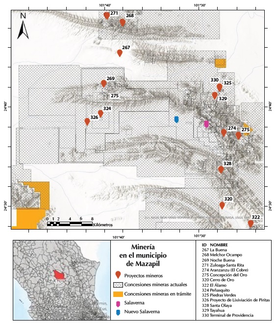 El área de estudio se localiza en el municipio de Mazapil, al norte del estado de Zacatecas, México (Mapa 1), que cuenta con 17 774 habitantes, según el Instituto Nacional de Estadística y Geografía (INEGI, 2020), y su estructura de población es rural con un grado medio de marginación, de acuerdo con el Consejo Nacional de Población (Conapo, 2021).1 Por su parte, Salaverna es una comunidad rural que actualmente cuenta con sólo ocho habitantes (INEGI, 2020). El área está prácticamente concesionada para actividades mineras con proyectos en operación, destacando Peñasquito, una gigantesca mina que consta de dos tajos a cielo abierto, propiedad de la empresa norteamericana Newmont (Uribe et al., 2020). Se considera que el análisis de este caso, que en la actualidad atraviesa un escenario de desplazamiento forzado, puede ofrecer resultados empíricos importantes para contrastarlos con la literatura al respecto y plantear aportes a la misma.