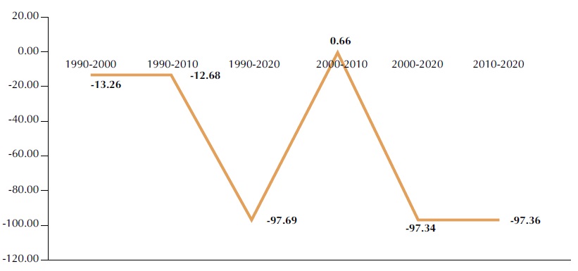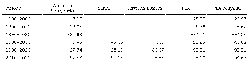 El periodo censal 2010-2020 marcó las transformaciones más drásticas para la localidad de Salaverna en el periodo largo de 1990-2020. Todos los indicadores sociodemográficos analizados descendieron, con un despoblamiento rural de -97.36% y el incremento de los niveles de envejecimiento y masculinidad, que llegaron a 300% (Cuadros 1, 2 y Gráfica 1). Estos cambios se dieron en el marco del proceso de desplazamiento forzado por la empresa minera: no toda la población llegó a Nuevo Salaverna; unas cuantas personas se quedaron en Salaverna y otras emigraron, especialmente las mujeres y los jóvenes.