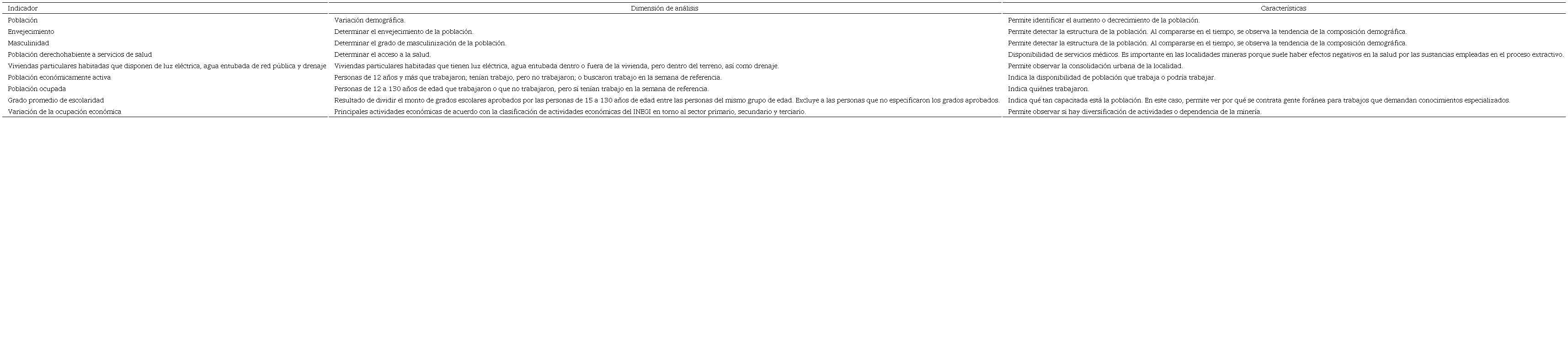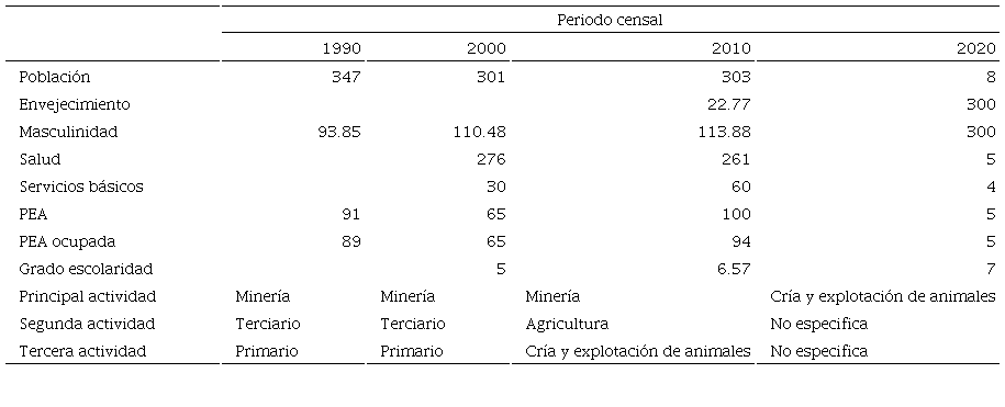 Se analizaron nueve indicadores (Cuadro 1), cuyos datos fueron recolectados de los Censos de Población y Vivienda (1990, 2000, 2010, 2020) del INEGI.3 Los indicadores fueron seleccionados luego de la revisión teórica sobre minería y despoblamiento rural, para determinar cómo se ha transformado la estructura demográfica y espacial de Salaverna y conocer las condiciones en que vive la población desplazada en Nuevo Salaverna.