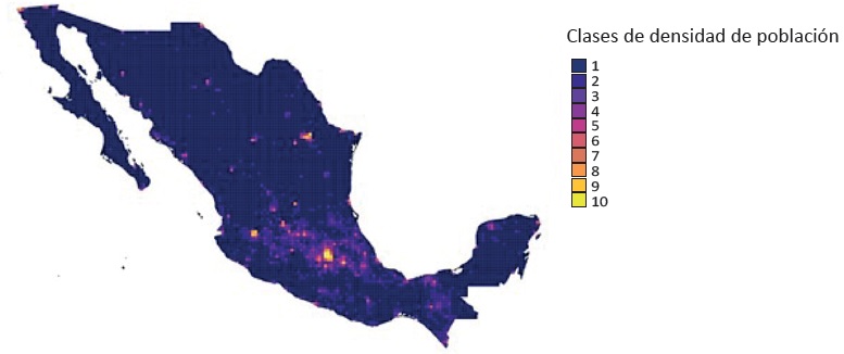 A continuación, se calcula la densidad de población de cada tile, dividiendo la población entre la superficie. Finalmente, se hace una clasificación de densidad de población de los tiles utilizando el método Jenks Natural Breaks para obtener 10 categorías de densidad de población, siendo la 1 y la 2 las de menor densidad, principalmente áreas rurales, y la 10 la de mayor densidad, que incluye únicamente la Ciudad de México. Las categorías 8 y 9 engloban otras ciudades grandes dentro del territorio mexicano, como Monterrey o Guadalajara. Las categorías 5, 6 y 7 están compuestas principalmente por ciudades medias, como Tijuana, Culiacán, Ciudad Juárez, Cancún o Puerto Vallarta. Las urbes pequeñas, como por ejemplo, Colima, Campeche o Ciudad Valles, se englobarían dentro de las categorías de densidad de población 3 y 4. Los rangos de densidad de población de las categorías son los siguientes: 1 (<100 hab./km2); 2 (100-401 hab./km2); 3 (401-997 hab./km2); 4 (997-2.006 hab./km2); 5 (2.006-3.265 hab./km2); 6 (3.265-4.857 hab./km2); 7 (4.857-6.660 hab./km2); 8 (6.660-7.676 hab./km2); 9 (7.676-10.287 hab./km2); y 10 (>10.287 hab./km2). La Figura 1 exhibe un mapa de México que muestra la distribución espacial de las diferentes categorías de densidad de población.