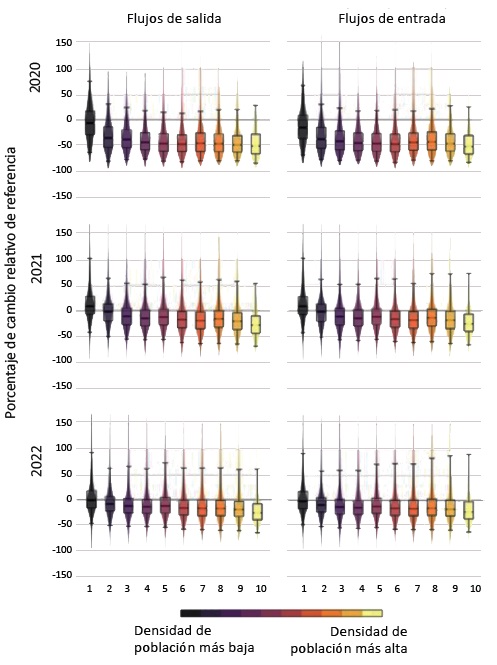 Una vez creadas las categorías de densidad de población, se une esta información a la base de datos de movimientos de Facebook. Con el fin de eliminar el efecto de la movilidad diaria, se seleccionan los movimientos de larga distancia (más de 100 km), que potencialmente representan viajes de varios días y migraciones internas que implican un cambio de residencia. Seguidamente, se calculan las variaciones porcentuales en los flujos de salida y entrada para cada tile en 2020 (desde el 2 de abril), 2021 y 2022 (hasta el 4 de mayo), en comparación al periodo de referencia anterior a la pandemia (los 45 días previos al 10 de marzo de 2020). Se utilizan gráficos de violín para representar el porcentaje de cambio de las salidas y entrada de usuario de Facebook en los tiles de cada categoría de densidades. Estos gráficos muestran la mediana, los cuartiles 1 y 3 y la dispersión de los cambios porcentuales en cada categoría de densidad.