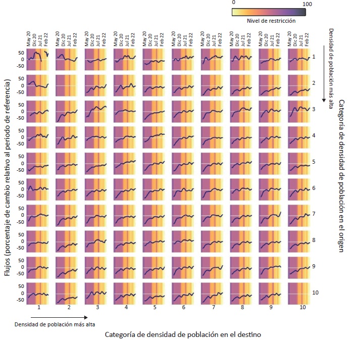 A continuación, se exploran los patrones de origen-destino de los movimientos de usuarios de Facebook a través de la jerarquía urbana durante la pandemia y se desagrega la información por meses. La Figura 3 muestra el cambio porcentual en los flujos de usuarios entre categorías de densidad de población desde abril de 2020 hasta mayo de 2022, respecto al periodo de referencia de 45 días anterior a la pandemia (previo al 10 de marzo). Los resultados se representan a modo de matriz migratoria entre las diferentes categorías de densidad de población, con los orígenes en las filas y los destinos en las columnas, ordenados de menor a mayor densidad (1-10). Si los valores están por debajo de 0 en el eje Y, significa que el flujo migratorio desde la categoría de densidad X a la categoría Y es menor que antes de la COVID-19; mientras que las cifras por encima de 0 indican un mayor número de movimientos. Por ejemplo, el cambio porcentual en el flujo de usuarios desde la categoría de densidad 9, ciudades grandes (origen en las filas), a la 10, Ciudad de México (destino en las columnas), muestra valores por debajo de 0 durante la primera mitad del periodo y posteriormente cercanos a 0, lo que significa que el flujo de usuarios desde las grandes ciudades a la Ciudad de México disminuyó y posteriormente recuperó los valores previos a la pandemia. Para poner en relación los cambios observados a lo largo del periodo de análisis con la intensidad de las restricciones, como limitaciones de movilidad o recomendaciones de permanecer en el domicilio, se incluye información del índice de restricciones del repositorio COVID-19 Government Response Tracker en el fondo de los gráficos de la Figura 3.