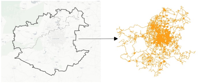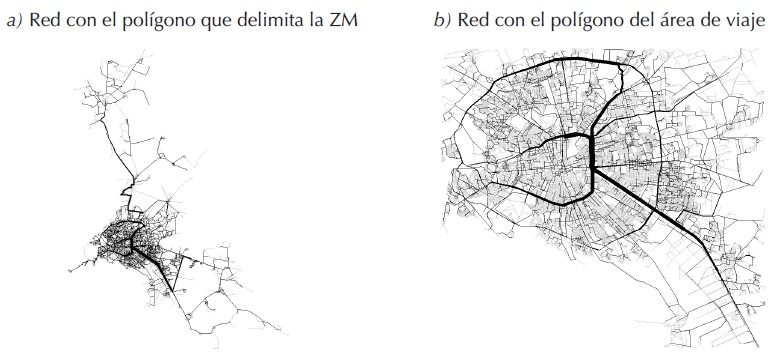 La Figura 6 ejemplifica el método que se usó para obtener las redes de vialidades a partir de los polígonos que delimitan cada ZM. Esto se realizó en Python 3.8.8, usando la librería OSMNX (Boeing, 2017), que permite descargar las redes de vialidades de OSM. Se usó esta fuente de información porque es relativamente sencillo tener redes conexas, es decir, redes en las que se puede llegar desde un punto hasta cualquier otro en la red; aunque parece trivial, esto no pasa (pasaba) con las redes de vialidades del Instituto Nacional de Estadística y Geografía (INEGI). En particular, se usó la función graph_from_ polygon, la cual recibe como elemento de entrada un polígono y se fijó el parámetro net work_type=”drive”. Luego, esta red se exportó mediante la función save_graphml.