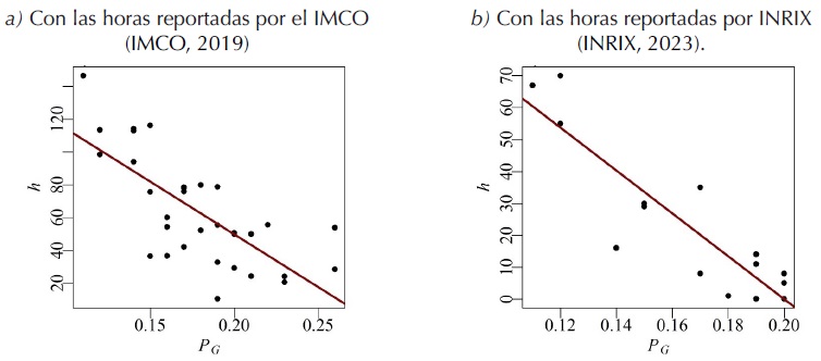 Para analizar la relación entre la concentración de la intermediación y la congestión, en la Figura 11 se muestran los diagramas de dispersión entre los valores PG y las horas perdidas debido a la congestión (h), con los datos del Imco (11a) y con los de INRIX (11b).