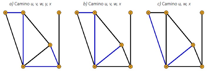 Por supuesto, puede haber más de un camino entre dos vértices, como se muestra en la Figura 2, donde se han representado tres caminos distintos entre el vértice u y el vértice x. Está claro que cada camino pasa por una cantidad distinta de aristas: el primero pasa por cuatro, el segundo por tres y el último sólo por dos. La cantidad de aristas que componen el camino es la longitud del camino. Entonces, se puede hablar del camino más corto entre dos vértices. En el ejemplo de la Figura 2, el camino más corto entre u y x es el u, w, x, es decir, el camino de longitud dos. Además, no sólo puede haber más de un camino entre dos vértices, incluso puede haber dos caminos más cortos; por ejemplo, otro camino más corto entre los vértices u y x es el u, v, x, que también es de longitud dos.