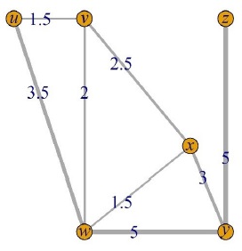 El resto de los valores de intermediación de las aristas de la red de referencia se muestra en la Figura 3, donde el grosor de las aristas es proporcional a dichos valores. En este ejemplo, las aristas y w y z y comparten el valor más grande, mientras que u v y w x el más pequeño. En este caso, la intermediación de la red (BG ) es igual a 24, ya que es la suma de las intermediaciones de las aristas.