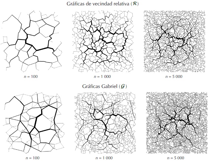 Para ejemplificar el proceso de la concentración de la intermediación se consideran dos tipos de redes planas: gráficas de vecindad relativa y gráficas Gabriel (Radke y Flodmark, 1999), las cuáles se denotarán por , respectivamente. Se seleccionaron las redes porque el patrón en los valores de PG es el mismo que en las redes de vialidades, esto es, conforme la red crece, aumenta el número de nodos, y el valor de PG disminuye (Pichardo-Corpus, 2023). Esta disminución no depende de la densidad de aristas en la red, ya que en las redes la densidad es constante, sino de la restricción de la red al espacio bidimensional.
