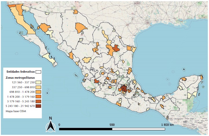 En la Figura 5 se presenta un mapa con la distribución espacial de las 74 zonas metropolitanas de México. El mapa muestra que éstas están distribuidas en el territorio de manera uniforme. Por otra parte, las ZM son muy diversas con respecto al tamaño de su población: 35 tienen entre 100 mil y 500 mil habitantes; 25 tienen más de 500 mil y menos de un millón; 11 tienen más de un millón y menos de tres millones; tres tienen más de cinco millones, y de éstas sólo la ZM del Valle de México tiene más de 20 millones de habitantes.