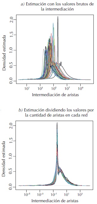 En la Figura 7 se muestran las curvas de densidad estimadas de la intermediación de aristas para las 74 zonas metropolitanas. En la Figura 7a se observa que cada curva tiene dos picos, esto implica dos tipos de regímenes en los valores de intermediación, y hay grupos de aristas con tales valores entre uno y dos órdenes de magnitud de diferencia.