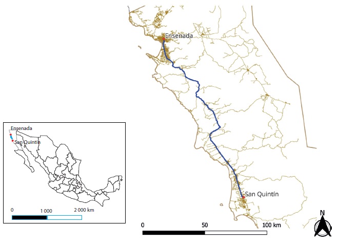 De acuerdo con el coeficiente de determinación (r2 = 0.67), casi el 70% de la varianza en los valores de PG se explica por el tamaño, lo cual confirma la hipótesis de que entre más grande es una red, más concentrada está la intermediación. La red de la ZM de Ensenada es un caso atípico, ya que tiene el mismo valor PG = 0.11 que la red de la ZM del Valle de México, pero la de la ZM de Ensenada tiene del orden de 104 vértices, mientras que la de la ZM del Valle de México tiene del orden de 105 vértices. Esto se puede explicar por dos variables importantes: la forma y el tamaño del polígono de la ZM de Ensenada. Como se puede apreciar en la Figura 9, el polígono de la ZM de Ensenada es muy alargado, ya que se encuentra en la costa de Baja California en un área donde la mayor parte está deshabitada. Sin embargo, la ZM de Ensenada es la más grande en superficie, con 53 mil kilómetros cuadrados, prácticamente del triple de la que le sigue en tamaño, que es la ZM de Chihuahua, con 18 mil kilómetros cuadrados (Sedatu et al., 2018, pp. 60-62). Estas características generan que haya mucha dispersión y pocas vialidades importantes que conecten las partes más lejanas de las áreas habitadas. Por ejemplo, la distancia por la ruta más corta entre Ensenada y San Quintín es de 190 kilómetros. Esta observación pone en evidencia un fallo en la delimitación de las zonas metropolitanas realizada en 2015. Actualmente, el polígono de la ZM de Ensenada está integrado por dos municipios más, San Quintín y San Felipe, los cuales no estaban constituidos como tales cuando se hizo la clasificación de las zonas metropolitanas en 2015. Cabe señalar que, recién finalizado este trabajo, fue publicada una nueva clasificación de zonas metropolitanas en la que ya no se incluye a San Quintín (Sedatu et al., 2023).