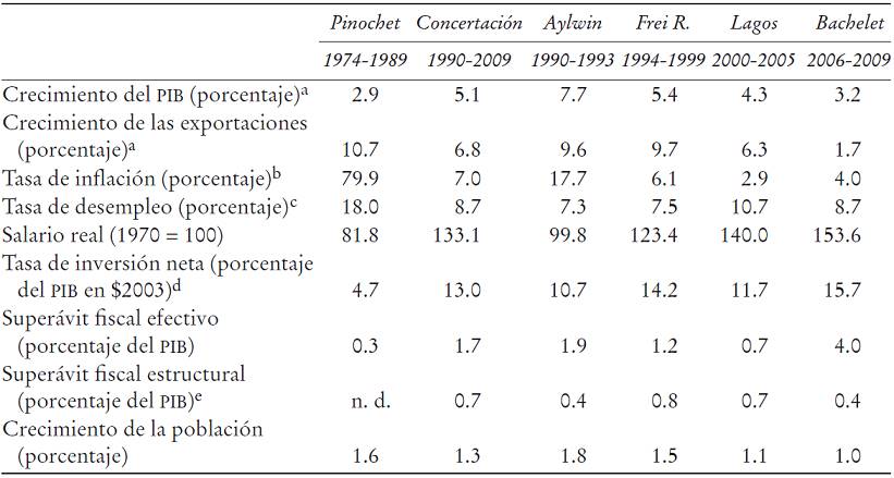El desempeño de los gobiernos de la Concertación se compara favorablemente con todos los regímenes que han administrado el país desde mediados del siglo XX, en términos de crecimiento del PIB (efectivo, potencial y per cápita), tasa de inversión productiva, inflación, evolución del nivel de los salarios reales, gasto social y superávit fiscal. Este buen desempeño significa que, en los 20 años de democracia que siguieron a la dictadura de Pinochet, Chile acortó, significativamente, la distancia con el mundo desarrollado y dejó atrás al resto de América Latina (véase el Cuadro 1). El contraste con el desempeño de la dictadura es notable. Esto, sin duda, refleja un predominio de los aciertos por sobre los yerros. Sin embargo, no fue un desempeño sostenido ni continuo, debilitándose aciertos clave y tomando fuerza algunos yerros y retrocesos.12