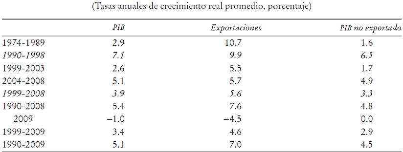 El vigoroso crecimiento del PIB efectivo y potencial, que persistió hasta 1998 sustentado en una elevada inversión productiva, fue liderado por una expansión anual de 10% de las exportaciones, similar al promedio registrado en las décadas de 1970 y 1980. Sin embargo, el crecimiento del PIB fue radicalmente distinto: 7.1% en la década de 1990 versus 2.9% en las dos décadas precedentes.9 Resulta obvio que el factor determinante del éxito en la década de 1990 es el notable crecimiento del resto de la producción, esto es, el PIB no exportado, que entre 1990 y 1998 se expandió a un promedio de 6.5% anual (véase el Cuadro 3). Las claves del éxito fueron los aun modestos, pero entonces crecientes eslabonamientos entre el sector exportador y el resto de la economía hasta mediados de la década de 1990 y la persistencia de una demanda interna que le permitió a los productores para el mercado nacional (que entonces cubrían alrededor de tres cuartos del PIB), operar persistentemente cerca de su capacidad plena hasta 1998. El desequilibrio macroeconómico cambiario desde 1996; sin embargo, ya se reflejaba en el estancamiento de la diversificación de las exportaciones, lentificación en la reducción de la pobreza y de la informalidad laboral, y acentuación de problemas en las pyme que competían con las importaciones.