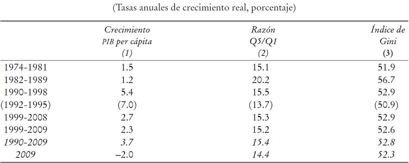 La primera mitad del periodo (1990-1998) involucró un crecimiento vigoroso del ingreso por habitante, triplicando el ritmo de los Estados Unidos o del G-7, con una considerable reducción de la brecha frente a esos países, y una moderación en la desigualdad de ingresos heredada (véase el Cuadro 4); es lo que se denomina significativa convergencia de Chile hacia el desarrollo. En cambio, en el segundo decenio (1999-2008), la velocidad del crecimiento por habitante se redujo a la mitad (aun sin considerar la caída de 2009) y se debilitó la intensidad de las mejorías en la distribución del ingreso y reducción de la pobreza. Chile continuó avanzando en la senda del desarrollo; es un error desconocerlo, pero lo hizo notoriamente más lento y seguía siendo muy regresivo.