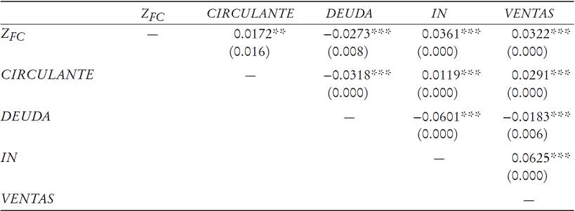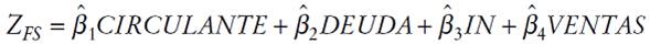 El análisis discriminante nos permite estimar los coeficientes y determinar la bondad de ajuste de la ecuación (3). Nuestros resultados concluyen que la expresión (3) clasifica exitosamente a las empresas en cada grupo 58.7% de las veces. Las estimaciones previas se aplican para construir un índice de puntuación financiera (ZFS ) que se muestra en la ecuación (4).