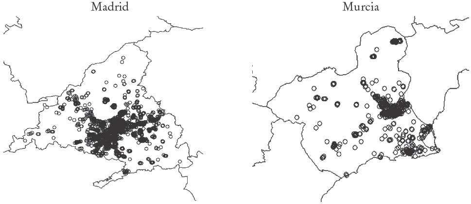 A fin de desarrollar nuestra aplicación empírica se utilizó la base de datos Sistema de Análisis de Balances Ibéricos (SABI). Ésta es una microbase de datos que recopila información de reportes financieros y de estados de pérdidas y ganancias de las empresas españolas y portuguesas inscritas en el Registro Mercantil. Seleccionamos regiones españolas para nuestro estudio debido a las características particulares de este país asociadas con su alta heterogeneidad regional en términos de sus indicadores económicos (Carbó et al., 2007). A fin de controlar por la heterogeneidad regional, se seleccionaron empresas pequeñas y medianas2 ubicadas en dos provincias españolas: Madrid y Murcia. Esta información permite analizar los resultados en dos regiones con características diferentes. En este orden de ideas, Madrid es una de las provincias más ricas en términos de su producto interno bruto (PIB) per cápita, con una alta concentración de empresas industriales y tecnológicas, mientras que Murcia tiene valores más bajos de PIB per cápita y un sector productivo basado en las actividades primarias con menores valores de productividad (Maté et al., 2009). La información disponible permite relacionar a cada empresa con su respectivo código postal. El Mapa 1 muestra la distribución espacial de las empresas de acuerdo con el código postal de 25005 pyme: 16595 en Madrid y 5410 en Murcia.3 Las zonas de mayor densidad están cerca de las zonas urbanas más grandes de Madrid y Murcia (véase el Mapa 1). Este resultado coincide con la distribución espacial de la población total de estas provincias.