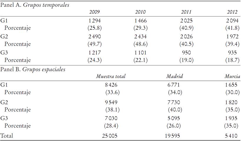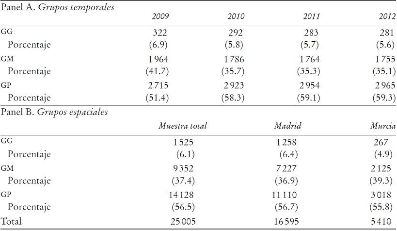 El Cuadro 1 presenta la distribución temporal y espacial de nuestra muestra en función del número de empleados. La distribución anterior coincide con los datos proporcionados por el INE para la población total. El panel A reporta la importancia de las pequeñas empresas en la economía española. Como se puede apreciar, mientras que el número de empresas que conforman los grupos Grande y Mediano disminuye, el número de pequeñas empresas aumenta desde 2009 (51.4%) y hasta 2012 (59.3%). Esto es de esperarse, ya que los periodos de recesión económica normalmente se caracterizan por un aumento en la cantidad de empresarios que tratan de mejorar su posición laboral mediante la creación de pyme (Kongolo, 2010; Choudhry et al., 2012). El panel B ofrece información de carácter espacial que muestra que, en ambas provincias, predominan las pequeñas empresas.