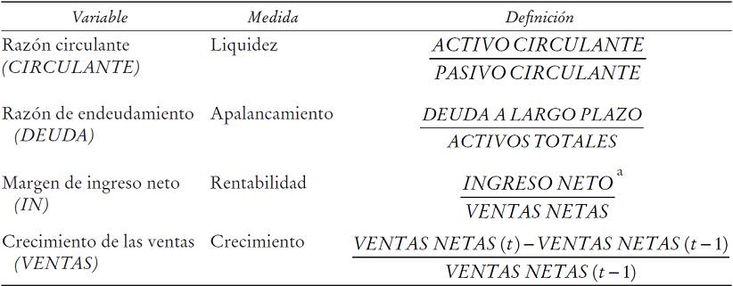 La ecuación (3) se construye bajo el supuesto de que el pago de dividendos se relaciona con la magnitud de los fondos internos de las empresas y, por tanto, con las medidas relacionadas con la solvencia financiera de las mismas, como son las tasas de liquidez, rentabilidad, endeudamiento o crecimiento (Cleary, 1999). El Cuadro 3 ofrece una descripción más detallada de estas variables.