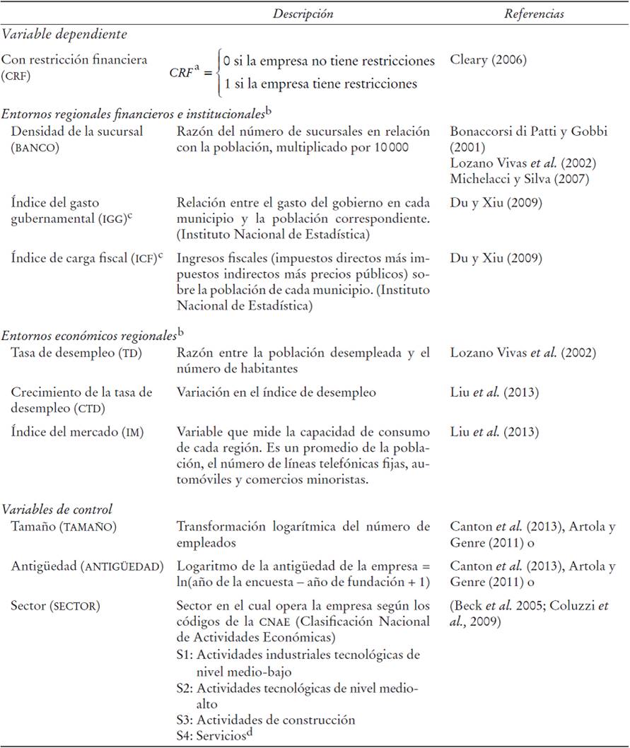 De acuerdo con la literatura anterior, el Cuadro 6 muestra las variables que se incluyen en este análisis como representativas de los distintos entornos regionales y las características de las empresas.