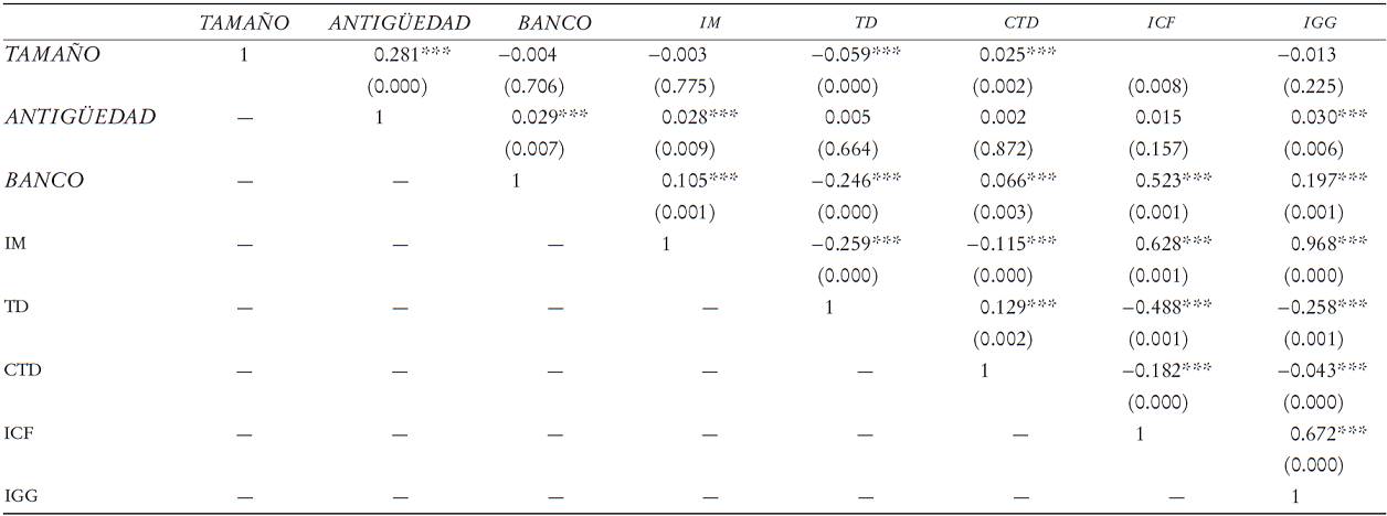 El Cuadro 7 muestra las correlaciones parciales que existen entre las variables y reporta las correlaciones por pares que existen entre las variables explicativas incluidas en nuestro análisis. Los resultados confirman nuestras expectativas. Por ejemplo, encontramos una correlación positiva y significativa entre las variables índice de carga fiscal (ICF) e índice del mercado (IM). Dado que el IM es un sustituto de la capacidad de consumo de una región, se espera que entre mayor sea éste, más agresivas serán las políticas tributarias (índice de carga fiscal, ICF) que imponga el gobierno. Asimismo, la relación que existe entre el índice de gasto gubernamental (IGG) y el ICF también es significativa. Los altos niveles de gasto gubernamental pueden compensarse con una mayor presión de las políticas fiscales tendientes a reducir el déficit presupuestal (Du y Xiu, 2009).