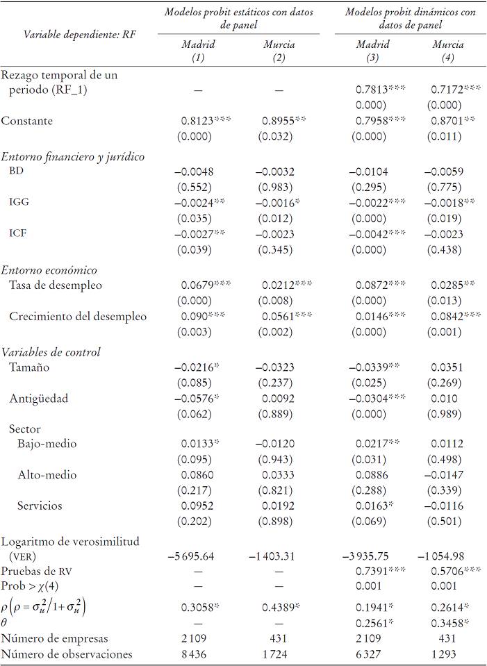 Esta sección muestra los resultados de la estimación para dos paneles de datos completos conformados por 2019 empresas de Madrid y 413 empresas de Murcia durante el periodo que va de 2009 a 2012.9 En ambos casos, aplicamos la metodología de modelos probit dinámicos y estáticos con datos de panel. El Cuadro 8 muestra nuestros resultados.10