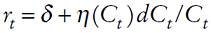 donde rt es la tasa instantánea de descuento sobre el consumo en el momento t; δ es la tasa pura de preferencia el tiempo cuando el numerario de la función de bienestar social es la utilidad; η(Ct ) es la elasticidad de la utilidad marginal respecto del consumo y mide la curvatura de η(Ct ) y dCt /Ct es el cambio porcentual en el consumo per cápita por unidad de tiempo.