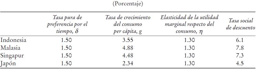 El artículo de Zhuang et al. (2007) supuso que δ es igual a 1.5%, siguiendo uno de los 13 estudios citados en su artículo, η = 1.3, y una tasa de crecimiento en el consumo per cápita, g, igual al promedio observado entre 1970 y 2004. El Cuadro 1 reproduce el cuadro de Zhuang et al. (2007) correspondiente.