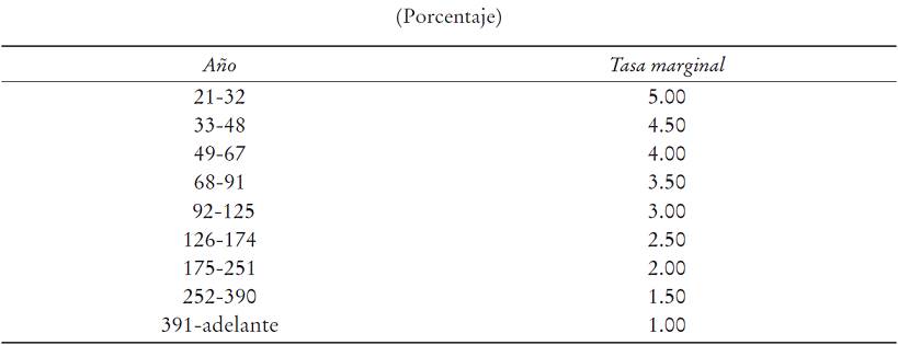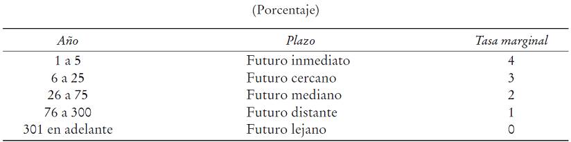 Además, se discretizó la variable tiempo, t, siguiendo el procedimiento utilizado por Weitzman (2001),12 el cual es consistente con la forma de la escala utilizada en el Reino Unido donde la tasa de descuento no varía en forma continua, sino en tramos de 0.5% de amplitud.