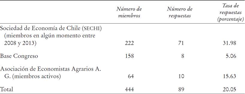 Por la razón anterior, se ha decidido incorporar, además de economistas, a políticos y a otros interesados en políticas públicas. Específicamente se envió la encuesta a: i) miembros de la Sociedad de Economía de Chile (SECHI); ii) miembros de la Asociación de Economistas Agrarios A. G. (AEA); iii) miembros del Congreso Nacional (senadores y diputados).