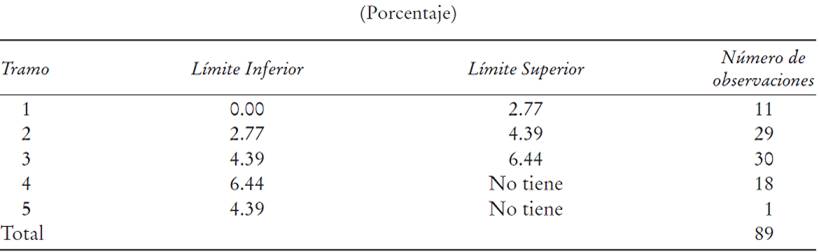A continuación se presentan los resultados de la encuesta respecto de la tasa de crecimiento del ingreso per cápita en el largo plazo (a partir de 2030) (pregunta 4). Se hace notar que el tamaño de la muestra en este caso es n = 83 en lugar de 89, debido a que seis personas no contestaron esta pregunta de la encuesta.