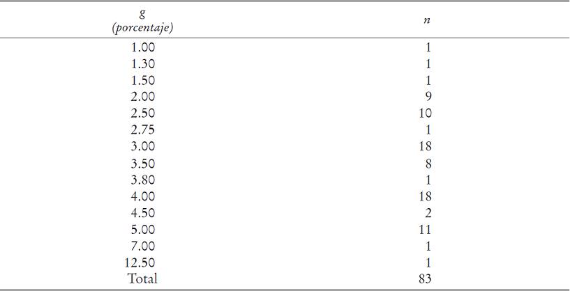 . Como en la función gamma, la media y la varianza son iguales a μ=α/β y σ2 =α/β2, lo anterior equivale a una media muestral de 4.9223% y una desviación estándar en la muestra de 1.9987%. Se hace notar que ambos valores son inferiores a los derivados en el estudio de Edwards (2002) donde la media muestral y la desviación estándar muestral fueron 7.37 y 2.98%, respectivamente.