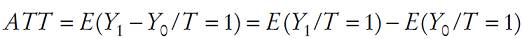 No obstante, algunas características de la distribución de Y1 − Y0 se pueden estimar (Heckman et al., 1998). Entre los parámetros objeto de interés en la evaluación de políticas públicas, uno de los más habituales es el impacto medio del tratamiento sobre los tratados (the average treatment effect on the treated, ATT), es decir, la diferencia entre los resultados esperados con y sin tratamiento para aquellos que participaron en el tratamiento:
