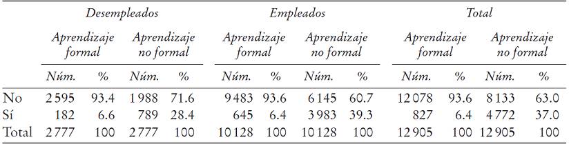 La muestra, con este criterio, está formada por 12 905 individuos. Su distribución según la situación laboral 12 meses antes y el tipo de formación recibida aparece recopilada en el Cuadro 1. Los datos muestran que de los 12905 individuos, 10128 se encontraban empleados 12 meses antes, mientras que 2777 estaban en situación de desempleo. Sólo 6.4% de todos los individuos participaron en una actividad de aprendizaje formal y 37% lo hicieron en actividades no formales. Si tenemos en cuenta la situación laboral anterior, la participación en actividades no formales es menor entre los desempleados que entre los empleados.