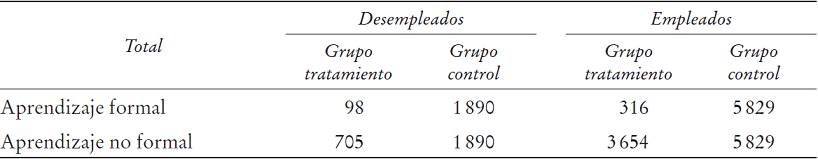 Para poder reducir en la medida de lo posible el sesgo de selección se ha realizado el análisis de forma separada para los que se encontraban en una situación previa de desempleo o de empleo. Asimismo, se ha considerado siempre el mismo grupo de control, es decir, los individuos que no han participado en ninguna actividad formal o informal. Esto significa que se ha eliminado del grupo de control a los individuos que teniendo una determinada situación laboral han realizado una actividad formativa distinta a la analizada y del grupo de tratamiento a aquellos individuos que han realizado los dos tipos de actividades formativas. Con ello el total de individuos es de 12 492. En el Cuadro 2 se presenta el tamaño de las muestras a partir del cual se ha realizado la estimación del impacto medio de la formación para cada uno de los colectivos.