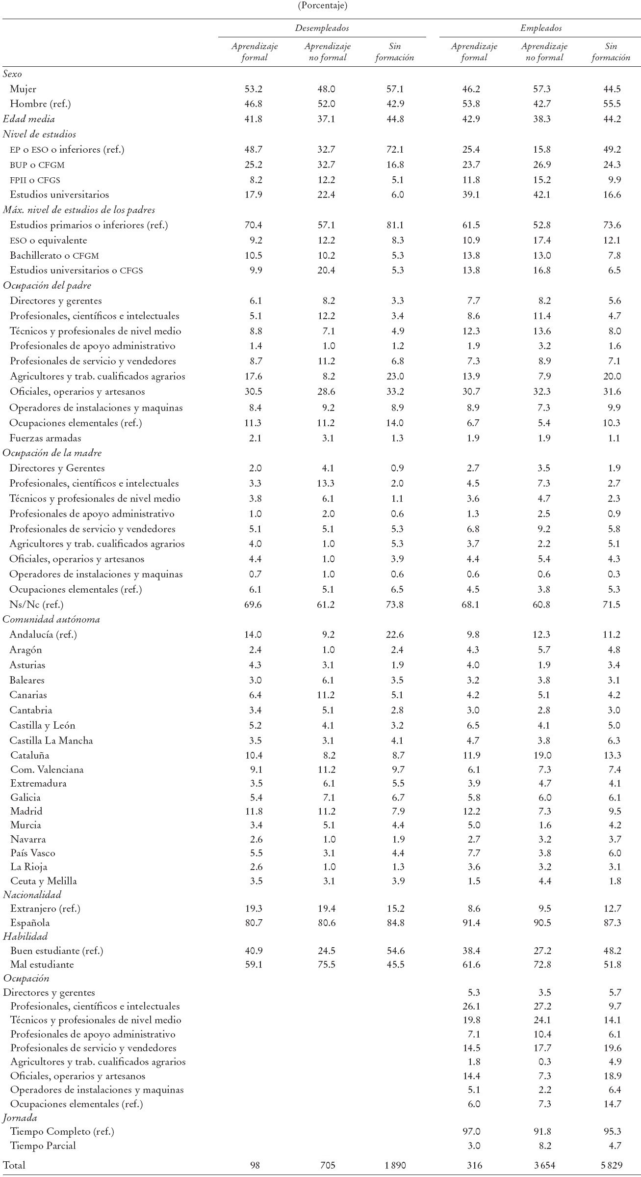 En este caso, la selección de las variables se ha visto condicionada por la información disponible y ha estado guiada por criterios teóricos recogidos en la literatura. Así, entre las variables que pueden incidir tanto en la probabilidad de participar en actividades de aprendizaje como en la probabilidad de estar empleado, se encuentran la edad, el sexo, la comunidad autónoma de residencia, el máximo nivel de escolaridad inicial alcanzado y si el individuo ha nacido en España. También se ha incorporado información relativa a los padres como un indicativo del bagaje y origen de los individuos, así como de su posible red social, tan importante en España. Las variables utilizadas han sido el máximo nivel de estudios de los padres y el tipo de ocupación del padre y de la madre. Finalmente, la habilidad de los individuos se ha recogido mediante una variable que toma el valor 1 si el individuo ha tardado más años que los reglamentarios para obtener su nivel de escolaridad inicial.3 Para el colectivo que parte de una situación de empleo 12 meses antes también disponemos de su ocupación y el tipo de jornada.