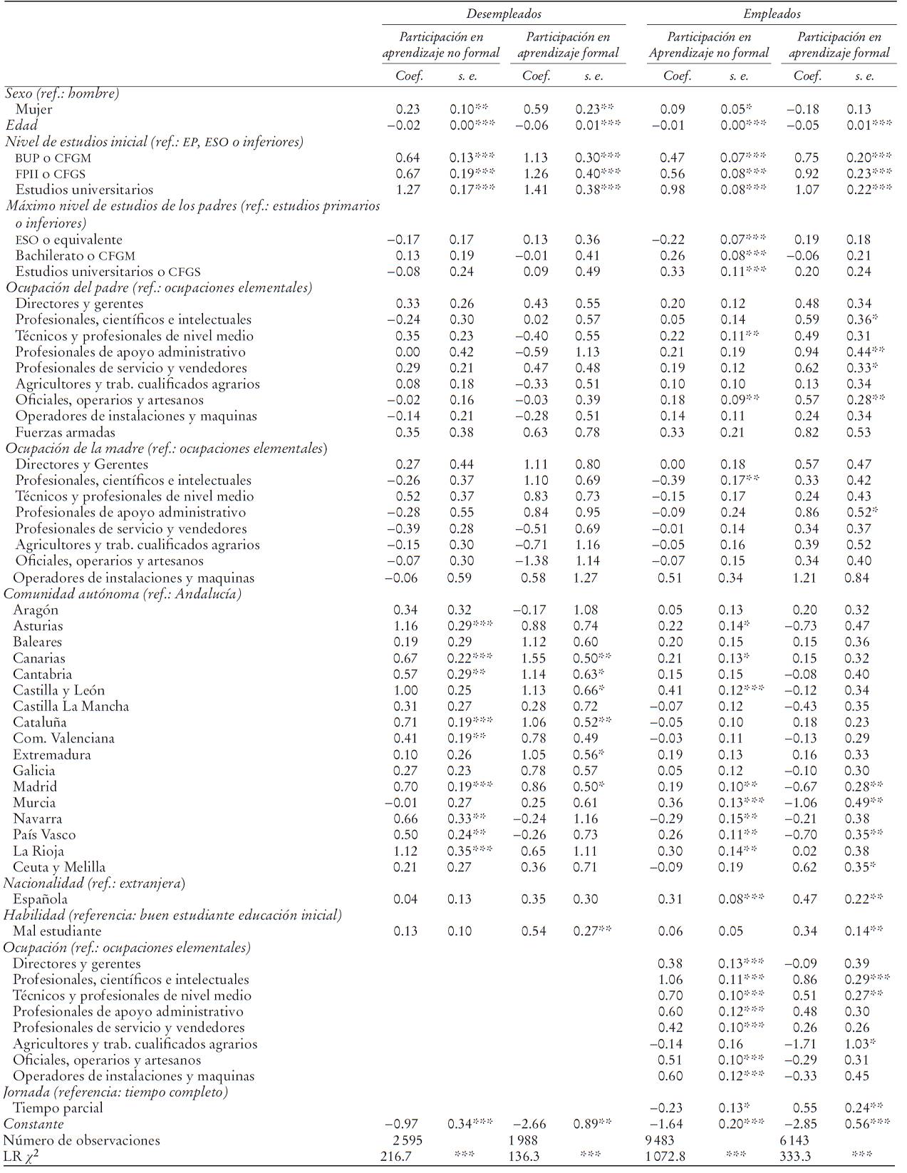 Otro resultado general, común a los encontrados en otros trabajos, es que la probabilidad de participar en cualquier tipo de actividad formativa, para ambos colectivos, se reduce con la edad y aumenta con el nivel de escolaridad inicial. Por otra parte, los españoles tienen más probabilidad de participar en acciones formativas que los extranjeros cuando están empleados; sin embargo, no se detectan diferencias significativas por nacionalidad entre los desempleados. Asimismo, el haber tardado más años en adquirir la escolaridad inicial eleva la probabilidad de participar en actividades formales, pero no genera diferencias significativas cuando las acciones formativas son no formales. El bagaje familiar no es significativo en el colectivo de desempleados; sin embargo, entre los empleados se observa una mayor probabilidad de participar en acciones formativas no formales para aquellos que tienen padres con un nivel de escolaridad más elevado y ocupan posiciones de técnicos profesionales de nivel medio o son oficiales, operarios y artesanos.